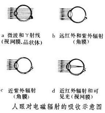 激光裝置對人體和工作環境造成的有害作用稱為激光危害,針對激光危害所采取的安全對策稱為激光防護。來自激光裝置的危害大致可分為輻射危害、電氣危害、化學危害和機械危害四類,通常只考慮輻射危害。 激光輻射能對人眼和皮膚造成傷害,其中以前者的后果最為嚴重。由于人眼對不同波長激光的透射和吸收不同,不同波長激光對人眼傷害的部位也不同(見圖[人眼對電磁輻射的吸收示意 圖])。