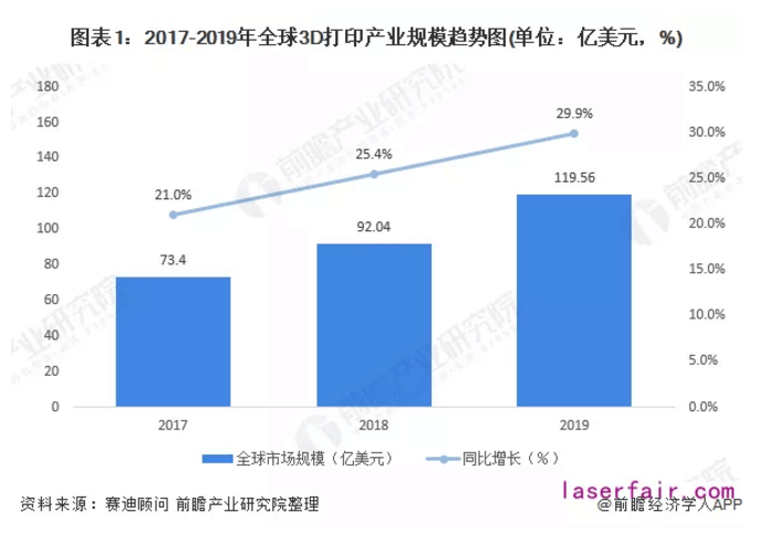 為解決疫情防控中應急物資短缺的難題,美國、意大利等國紛紛利用3D打印機生產呼吸機配件、個人防護面罩,甚至還創建了在線論壇,用于政府、醫院、非政府組織發布需求,以及業內人士分享經驗等。3D打印在全球疫情防控中發揮的作用,反映出這項技術普及度的提高和應用領域的擴展。全球3D打印市場規模破百億美元3D打印技術最早可以追溯到1976年噴墨打印機的發明。20世紀80年代以后,3D打印行業受到國內外的廣泛關注,各種3D打印技術也在多個行業應用并發展。目前已覆蓋了制造、醫療、教育、航空航天、軍事等多個領域。根據2020年3月賽迪顧問發布的《2019年全球及中國3D打印行業數據》,2019年,全球3D打印產業規模達119.56億美元,增長率為29.9%,同比增長增加4.5%。