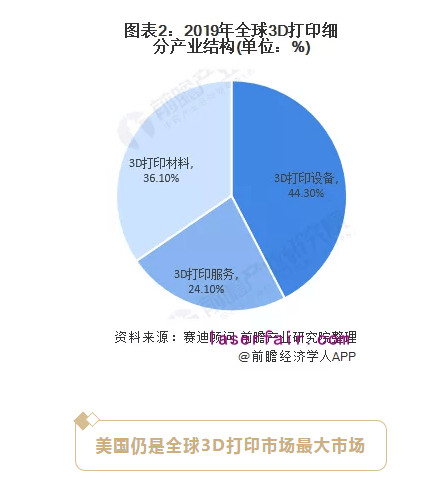 2019年,全球3D打印產業結構中,3D打印設備為核心產業,其產業規模為52.97億美元,占比達到44.3%;其次為3D打印服務產業規模37.78億美元,占比達到31.6%;3D打印材料產業規模28.81億美元,占比24.1%。