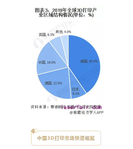 2019年美國產業規模占全球比重40.4%,德國僅次于美國,中國位居第三。作為3D打印起步較晚的中國,近幾年,抓緊自主創新和研發,雖然和國外的技術還有一定差距,但也一步步朝著精細化和專業發展。當然,國內巨大的市場潛能,也吸引了不少國外3D打印行業巨頭的目光和投資,進一步推動了中國3D打印產業的發展。