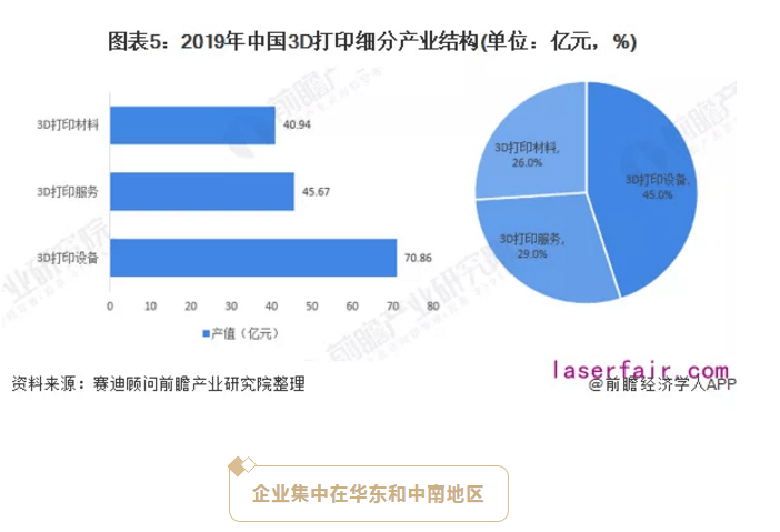 2019年,中國3D打印設備產業規模70.86億元,占比最高,達到45%;3D打印服務產業規模45.67億元,占比29%;3D打印材料產業規模40.94億元,占比26%。