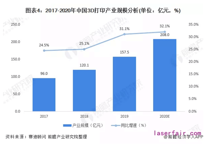 近年來,我國3D打印市場應用程度不斷深化,在航空航天汽車、船舶、核工業、模具等領域均得到了越來越廣泛的應用。3D打印技術已經成為航空航天等領域直接制造機修復再制造的重要技術手段。在汽車、船舶、核工業、模具等領域成為產品設計、快速原型制造的重要實現方式。2017-2020年,我國3D打印產業規模逐年增加,增加速度要略快于全球整體增速,以致于我國3D產業占全球的比重在不斷增加。根據2020年3月賽迪顧問發布的《2019年全球及中國3D打印行業數據》,2019年,中國3D打印產業規模為157.5億元,較上年增加31.1%。
