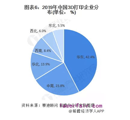2019年,華東地區為中國3D打印企業主要聚集區域,占據全國42.4%。中南、華北、西南等地區也有優秀企業集聚,分別占據23.8%、13.9%和8.4%的企業資源。華東地區的3D打印知名企業包括湖南華曙高科技有限責任公司、杭州先臨三維科技股份有限公司、上海光韻達三維科技有限公司、上海曼恒數字技術有限公司;中南地區的3D打印知名企業包括深圳市光華偉業實業有限公司、湖北嘉一三維高科股份有限公司等。
