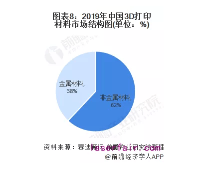 2019年,中國3D打印材料產業結構中,非金屬材料產業規模25.38億元,占比最高,達到62%;金屬材料產業規模15.56億元,占比38%。