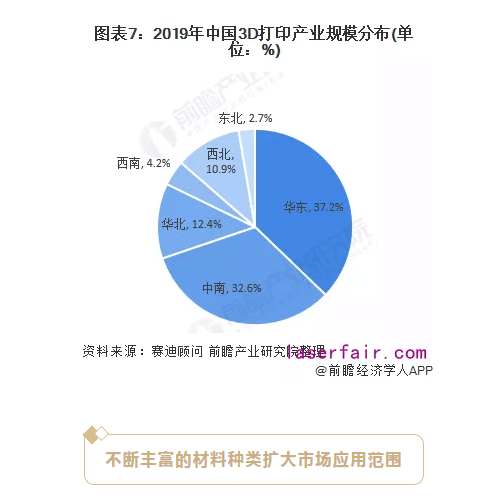 2019年,中南和華東地區由于3D打印設備與服務能力突出,產業規模分布位居全國第一、第二,分別占比37.2%和32.6%。華北地區則由于3D打印材料和服務能力突出,產業規模位居全國三位,占比12.4%。