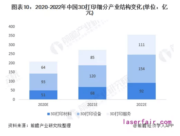預計2020-2022年,3D打印設備依舊占據最大份額,占比逐年小幅下降,2022年,產業規模為154億元,占比達到43%。3D打印服務占比上漲,2022年,產業規模為111億元,占比為31%。3D打印材料未來三年占比保持穩定,2022年,產業規模為92億元,占比26%。
