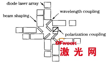 圖7 波長禍合原理示意圖 由于半導體激光是線偏振光,可以用λ/2波片將其偏振方向旋轉90度。 ,因此通過偏振禍合可使2路激光合束,功率密度再增加1倍。偏振禍合原理如圖8所示。