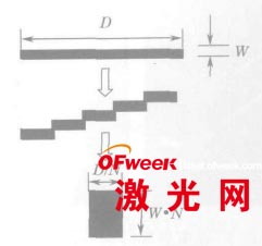 1.1、光束對稱化 由于半導體激光陣列的輸出光束在快慢軸上的光束參數乘積極其不對稱,這使得半導體激光陣列的輸出光束很難被聚焦成小而圓的光斑從而將其藕合進光纖系統。其中光束參數乘積(BPP)定義為激光光束束腰半徑和發散角的乘積,是衡量光束質量好壞的重要指標,它反映了光束的聚焦能力。對于半導體激光一維陣列,其慢軸上的BPP值是快軸BPP值的100-1000倍。為了 提高半導體激光器的功率,往往將多個半導體一維陣列(bar)疊加,形成一個二維陣列,即半導體激光堆棧。但是堆棧的慢、快軸上的光束參數乘積仍然相差約兒十倍。 若想使半導體激光陣列的光束在快慢軸上的光束參數乘積均勻化,必須采取光束整形。將半導體激光陣列的輸出光束進行分割、重排,通過減小慢軸方向、增大快軸方向的光束參數乘積的方法達到快慢軸光束參數乘積均勻化的目的。 光束整形原理如圖3所示。半導體激光陣列光束的尺寸為慢軸方向D.快軸方向W.將光束沿慢軸方向分割N.段,重排后光束的尺寸為慢軸方向D/N,,快軸方向W·N,使光束的光參數積BPP近似相等。