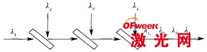 為了提高半導體激光器的功率,在不增加快軸方向光斑尺寸的情況下,采用了多波長禍合技術。本系統由808nm,915nm,940nm,980nm 4個波長組成。經過波長鍋合單元,可使功率密度提高3倍。波長藕合原理如圖7所示。