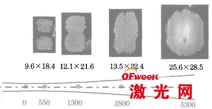 激光器光束質量測量采用在不同距離上測量光斑大小,計算其發散角,最后得出光參數積的方法。圖9是光束傳輸到不同距離時用相紙得到的光斑情況(單位:mm)。