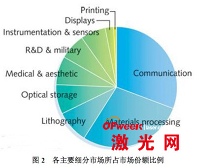 就細分市場而言,盡管光存儲激光銷售市場份額顯著下降,但是通信和光存儲業務仍然占激光產業中最大部分,其次是材料加工和光刻部分。但在2013年度,醫療和美容激光器市場份額超過了科研和軍事部分激光器以及儀器儀表傳感器類別激光器的銷售額。