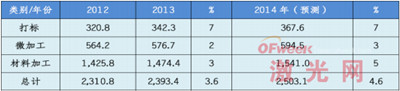 2013年工業激光打標和雕刻約占激光總收益的14%。其中光纖激光器占據了主要地位(約占66%),年增長率為13%。工業激光打標市場在2013年增長了6.7%,預計2014年的增長率將為7.4%(見下圖)。
