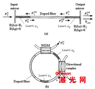 按增益介質(zhì)的不同,光纖激光器可以分為摻雜光纖激光器和受激散射光纖激光器兩大類。摻雜激光器的增益介質(zhì)主要是稀土光纖,激光產(chǎn)生機制是受激輻射。受激散射光纖激光器的發(fā)光機制是非線性效應,主要是受激拉曼散射和受激布里淵散射。 按激光腔結(jié)構的不同,可以分為線形腔、環(huán)形腔等,如圖2所示。用光纖光柵代替腔鏡,線形腔又分為布反饋(DFB,Distributed-Feedback)和分布布格反射(DBR,Distributed Bragg Reflector)之分。線形腔光纖激光器結(jié)構簡單能實現(xiàn)高功率和單縱模輸出,二環(huán)形腔光纖激光器結(jié)構元件較為復雜,通常是多縱模輸出。